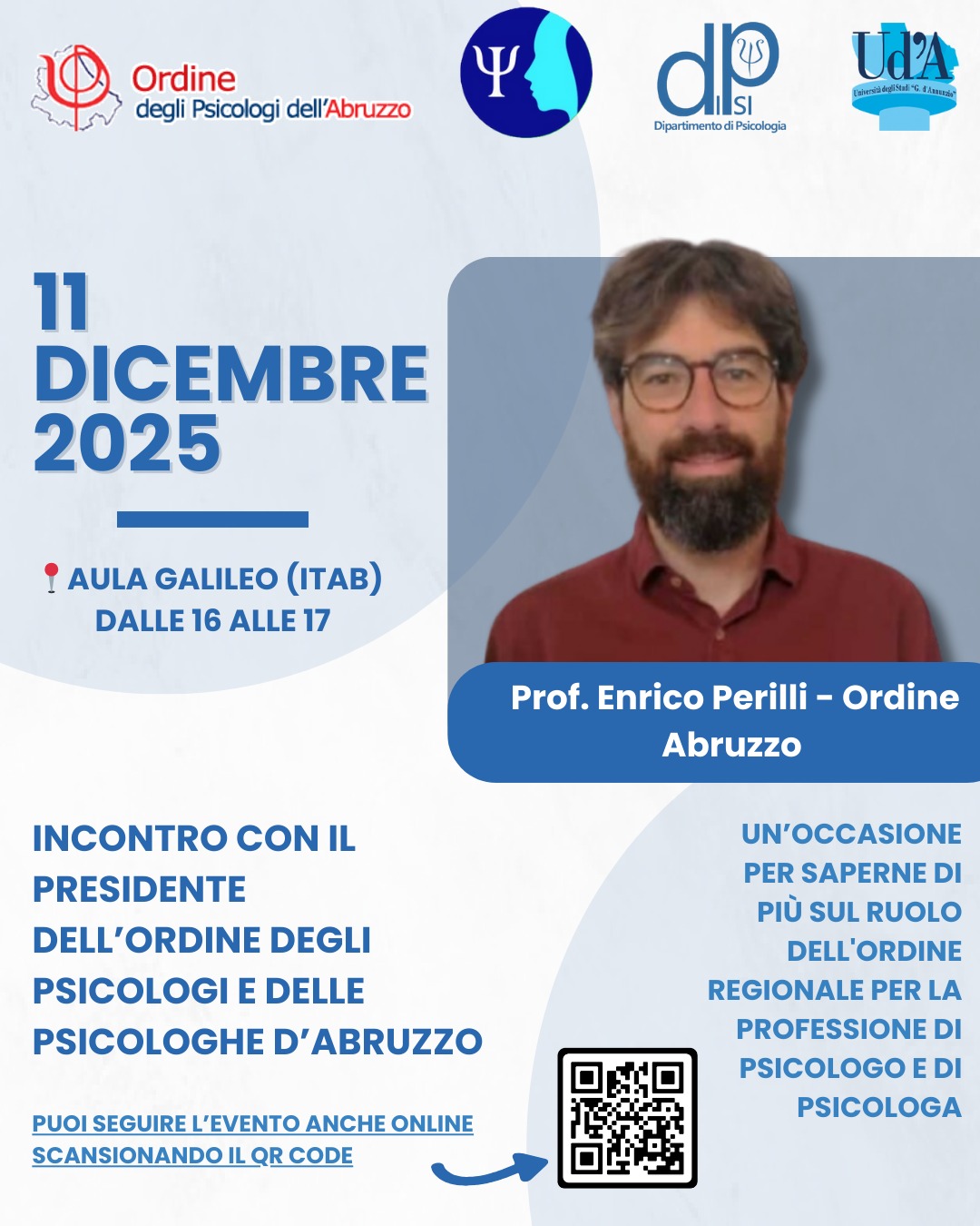 Giovedì 11 dicembre, dalle ore 16:00 alle 17:00, presso l’Aula Galileo (Centro ITAB), il Corso di Laurea Magistrale in Psicologia ospiterà il Presidente dell’Ordine degli Psicologi e delle Psicologhe della Regione Abruzzo, prof. Enrico Perilli.